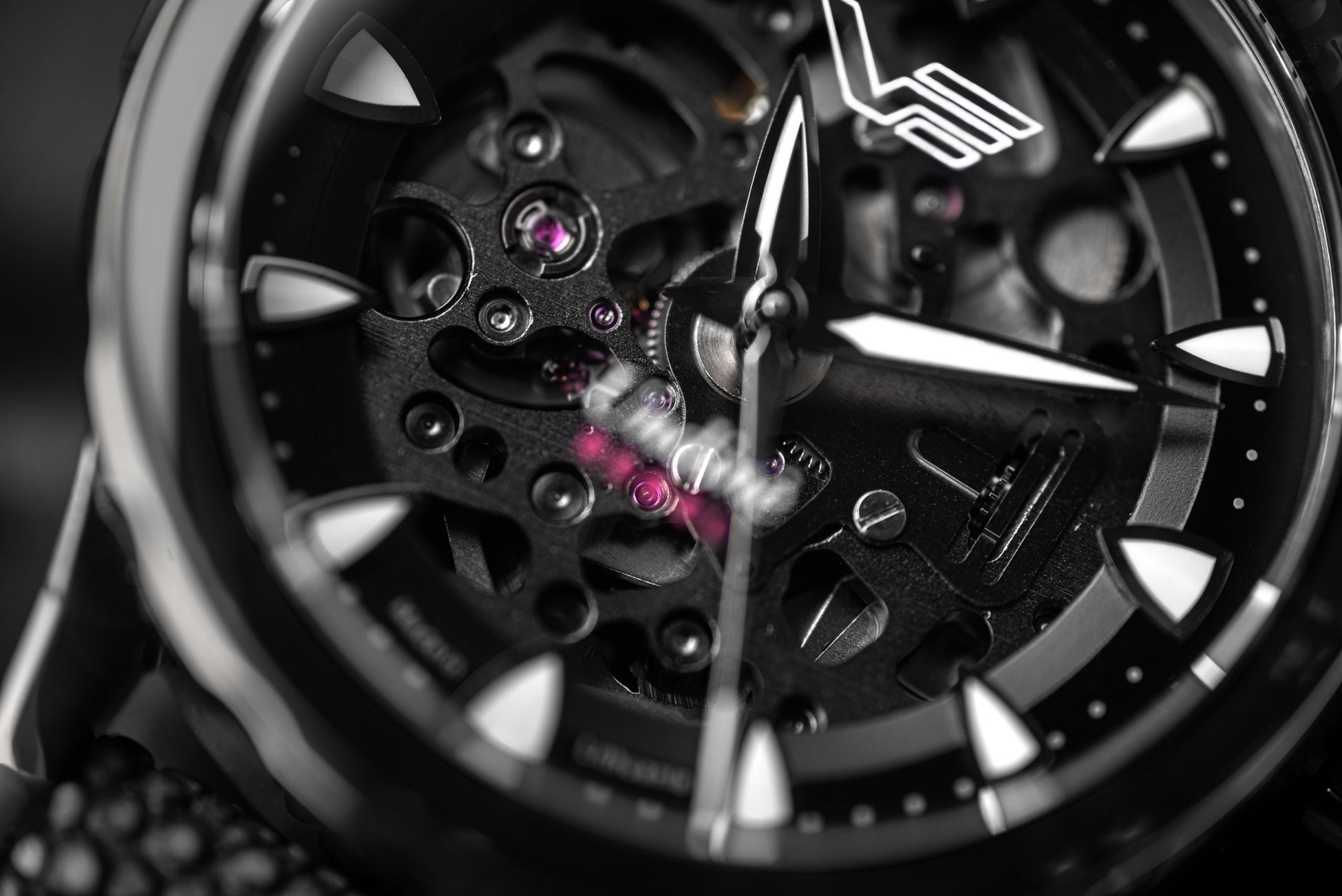 ルテニウムメッキが施された日本製自動巻きスケルトンムーブメントを搭載。