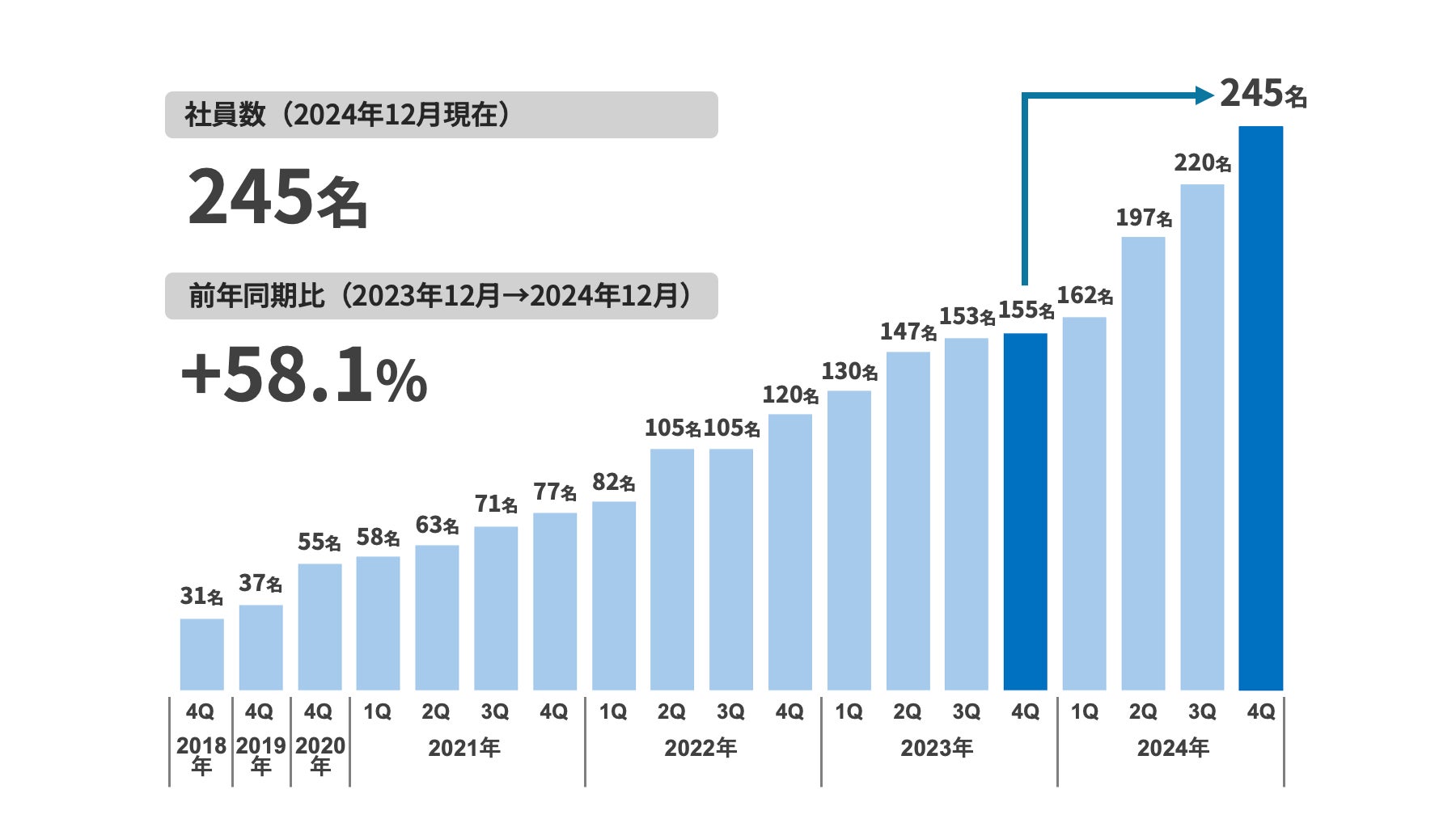 2015年の会社設立以来、着実な事業拡大に伴い社員数も増加し続け、2024年12月末時点で245名となりました。継続的な事業拡大を見据えたさらなる採用強化と、コロナ禍の収束によるオフィスでのコミュニケーション機会増加の観点から、オフィス環境の整備に伴う業務効率向上を目的として18階全フロアの増床が完了しました。