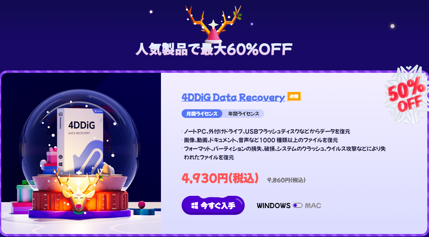 【超お得】4DDiGクリスマス&新春セール実施中!データ復元ソフト50% OFF