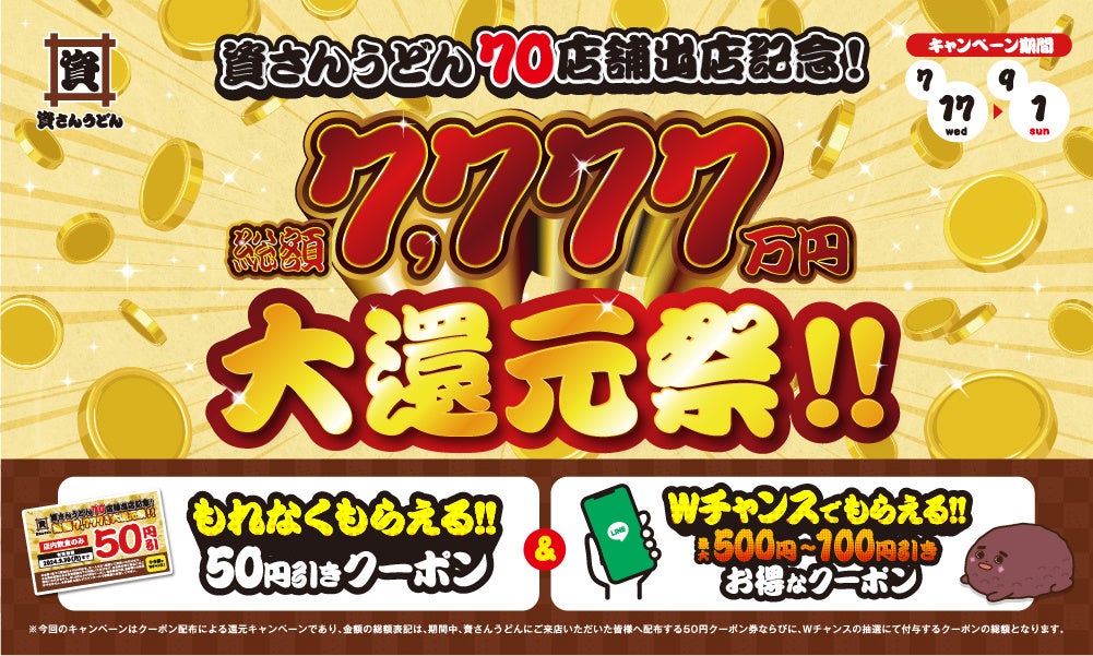 北九州のソウルフード「資さんうどん」は7/17(水)〜9/1(日)の期間にて、資さんうどん70店舗出店記念、クーポン大還元祭を開催。還元総額は7,777万円!!クーポンをゲットして「資さん」へ行こう!