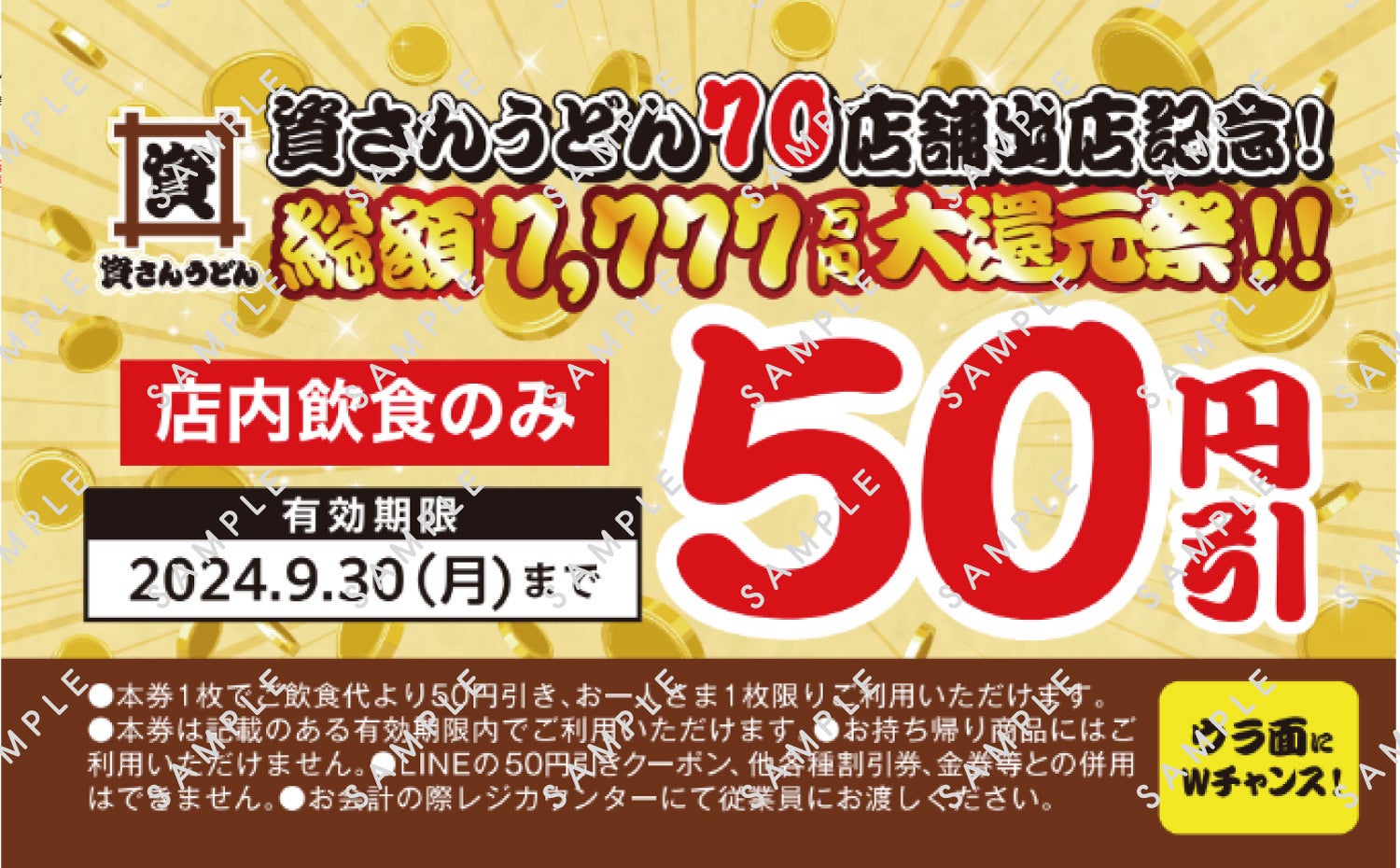 ●今回のキャンペーンはクーポン配布によるキャッシュバックキャンペーンであり、金額の総額表記は、期間中、資さんうどんにご来店いただいた皆様へ配布する50円クーポン券ならびに、Wチャンスの抽選にて付与するクーポンの総額となります。