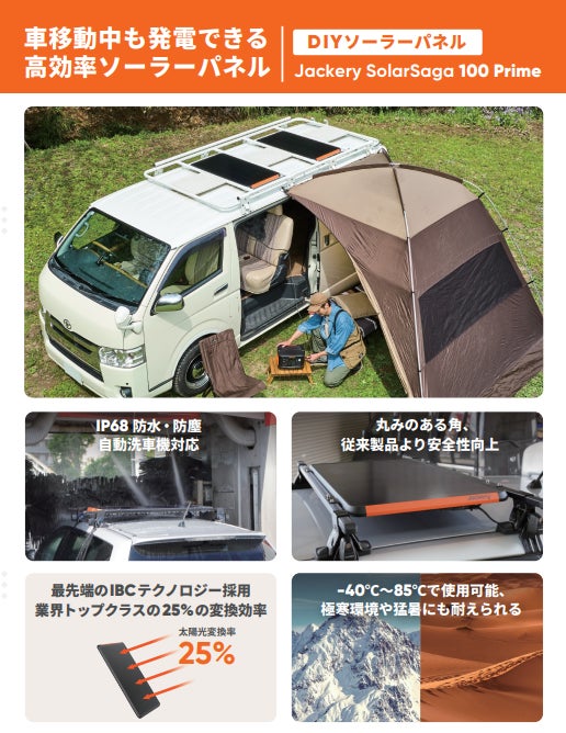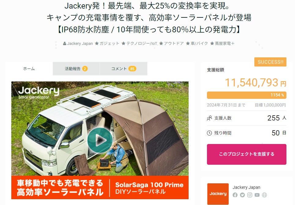 ポータブル電源・ソーラーパネルのリーディングカンパニー・Jackeryの日本法人である株式会社Jackery Japan(所在地:東京都中央区)は、2024年5月30日(木)よりクラウドファンディングプロジェクト「太陽光の力で移動中でも発電できる DIY ソーラーパネル『Jackery SolarSaga 100 Prime』」をスタートしました。おかげさまで多くの方にご支援頂き、開始からわずか8時間で目標金額100万円を達成しました。さらに、本日19時まで応援購入総額1,154万円を突破しました。
