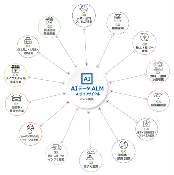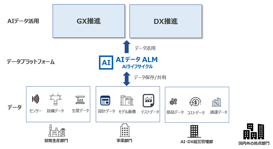AIデータマネジメント ALMは、これらの分野で AIシステムを基盤とするGXとDXを推進する上で各企業の AI・DX経営管理部、事業部、開発生産部、国内外の拠点部門の連携を計るデータのやり取り、共有、保存管理のためのGXデータプラットフォームです。