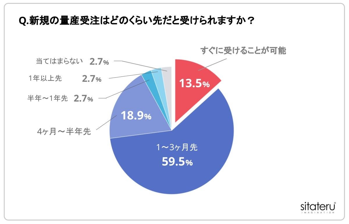 「Q.新規の量産受注は、どのくらい先だと受けられますか?」と質問したところ、「すぐに受けることが可能」と回答したのはわずか13.5%にとどまりました。最も多かったのは「1~3ヶ月先」で59.5%、続いて「4ヶ月〜半年先」が18.9%、「半年〜1年先」は2.7%という結果となりました。