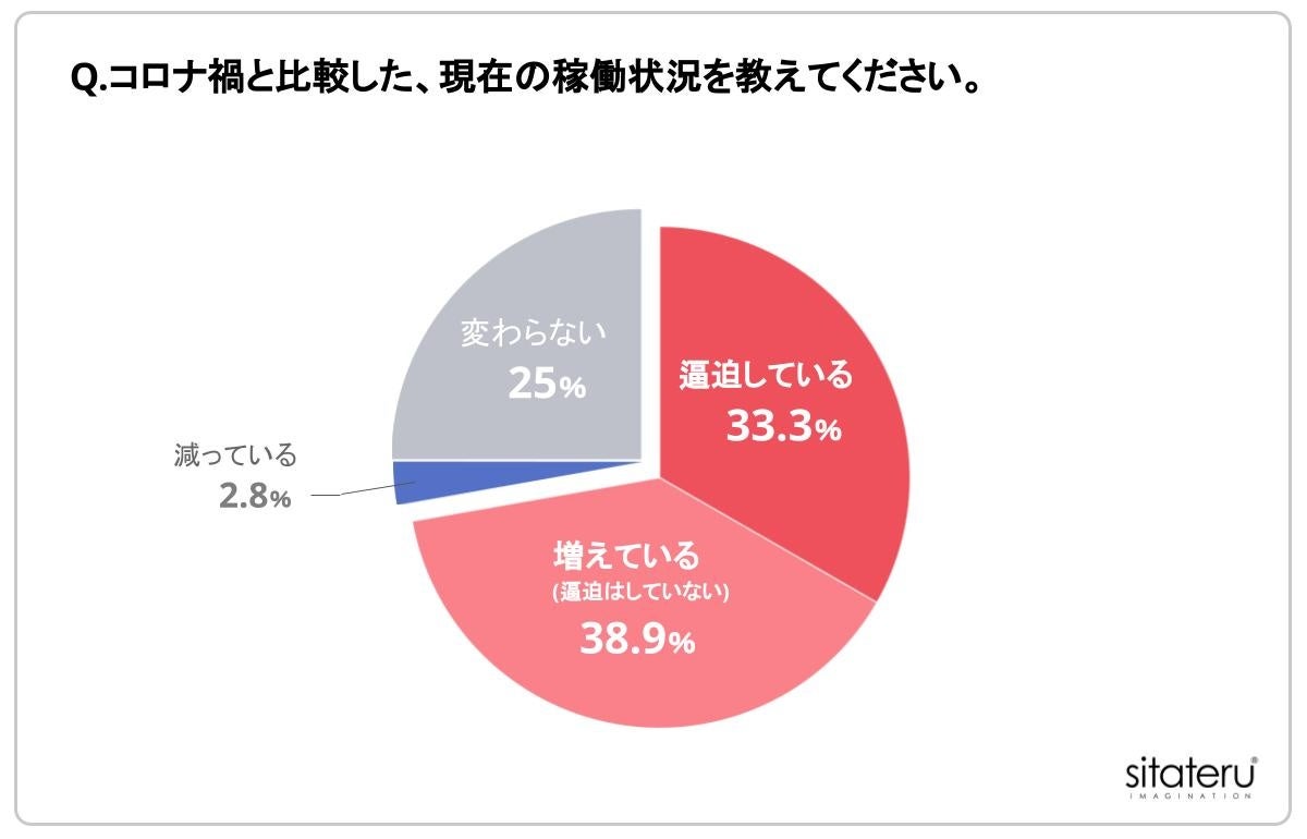 「Q.コロナ禍と比較した現在の稼働状況を教えてください。」と質問したところ、「逼迫している」33.3%、「コロナ禍に比べて増えている」38.9%という結果になり、7割以上の企業がコロナ禍に比べて稼働が増加していることがわかりました。