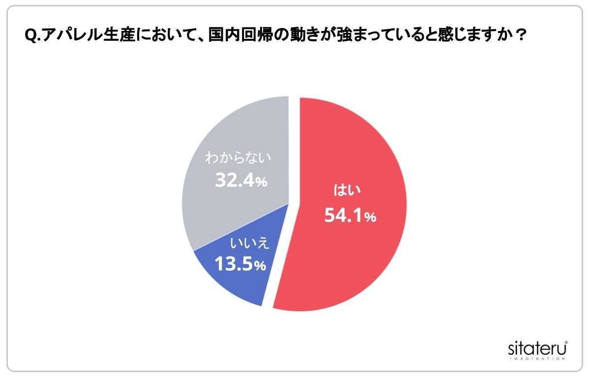 「Q.アパレル生産において、国内回帰の動きが強まっていると感じますか?」という質問に対して、半数以上の54.1%が「はい」と回答しました。
