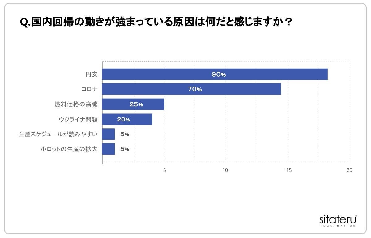 また、「はい」と回答した人に対して、「Q.国内回帰の動きが強まっている原因は何だと感じますか?」と質問したところ、9割が「円安」と回答、そして7割が「コロナ」、2.5割が「燃料価格の高騰」と答えました。
