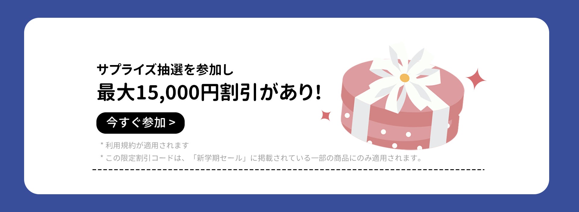 新学期のドキドキを楽しみながら、ラッキードローに参加してみましょう!サプライズボックス・ページでメールアドレスを入力するだけで、限定割引クーポンがもらえるチャンス。購入の必要は一切ありません。このラッキードローで、新学期を幸先の良いスタートにしましょう!