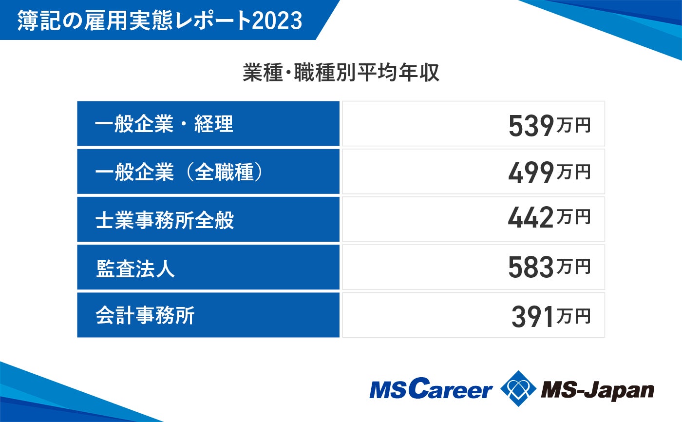 また、業種・業界別の平均年収は、「監査法人」所属が最も高く584万円、続いて「一般企業・経理」が539万円、「会計事務所」所属は最も低く391万円と、業界・業種によって差が出る結果となりました。