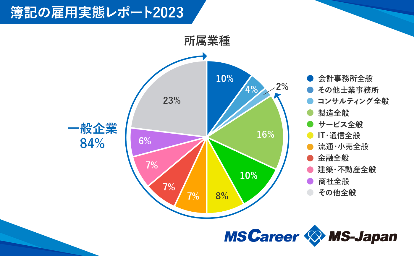 簿記保有者の所属業種と、業種・業界別の平均年収に関する調査では、全体の84%が一般企業に、10%は会計事務所に所属していることが明らかになりました。