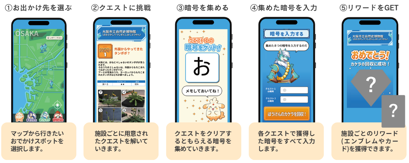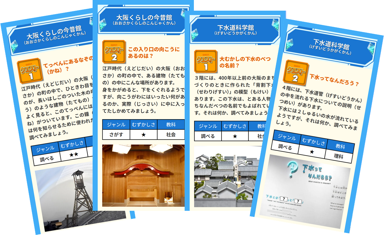 各文化施設とのコラボレーションによってクエストを作成。江戸時代の大阪の町や時代ごとのくらしのうつり変わり、くらしを支えるインフラなどをテーマにしたクエストを展開します。