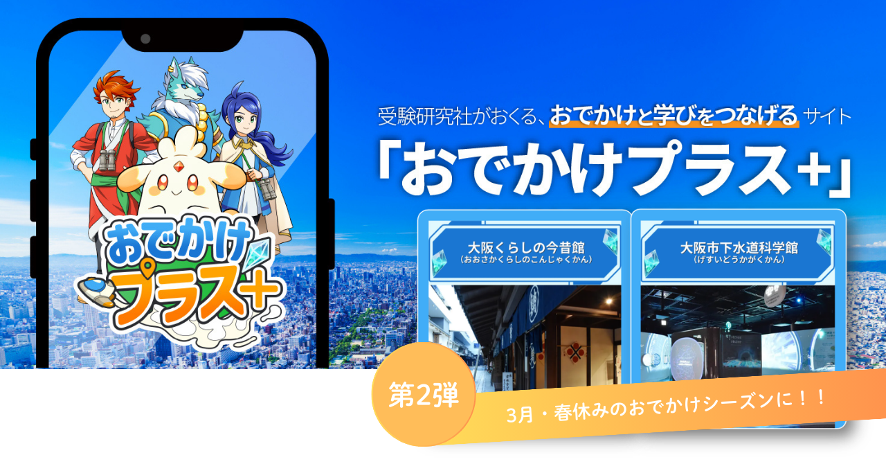 株式会社増進堂・受験研究社(本社:大阪市西区、代表取締役:岡本泰治)は、おでかけと学びをクロスさせた新しい体験型のコンテンツ「おでかけプラス+」に、春休みのおでかけシーズンに向けて、新たに「大阪市立住まいのミュージアム「大阪くらしの今昔館」(2026年3月5日公開)」と「大阪市下水道科学館(2026年3月12日公開)」のコンテンツを第2弾としてリリースします。