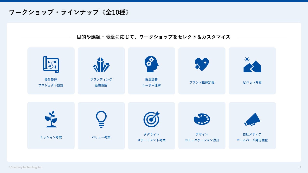 ブランディングテクノロジー株式会社(代表取締役社長:木村 裕紀、本社:東京都渋谷区、証券コード7067、以下当社)は、中堅・中小企業様のブランディングの取り組みにおける陥りやすい課題に対応したブランディングワークショップ《全10種》をリリースしました。