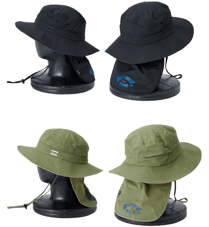 UV プロテクション(UPF50+)を備えたハット。メイン素材にポリエステルを使用し、首の日焼けを防止するサンシェードには、ORIONBEER とBILLABONG のロゴをプリントしました。便利なループストラップ付きで、水陸どちらでも使用可能です。サイドにワンポイントと、たれ部分にコラボロゴを配置。 |
