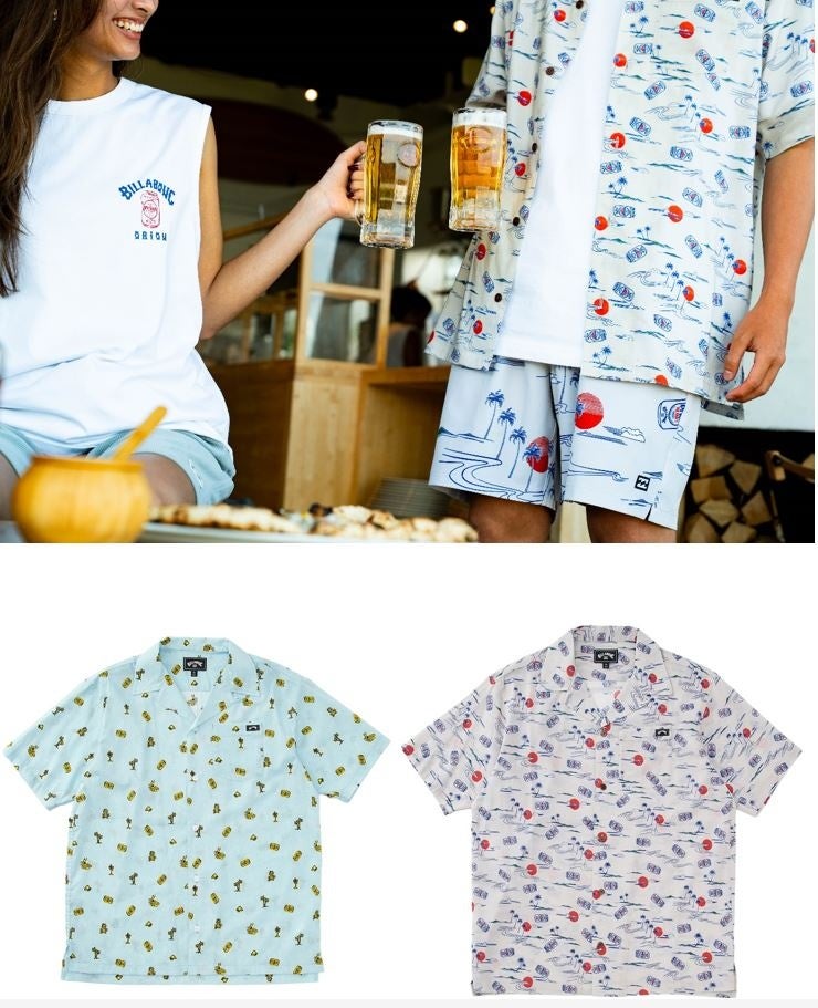 バックスタイルのORION BEER を散りばめた総柄パターンと、ウェーブロゴが目を惹くデザイン。左胸には、BILLABONG のアーチロゴと、ORION BEERの缶のグラフィックをレイアウト。 |