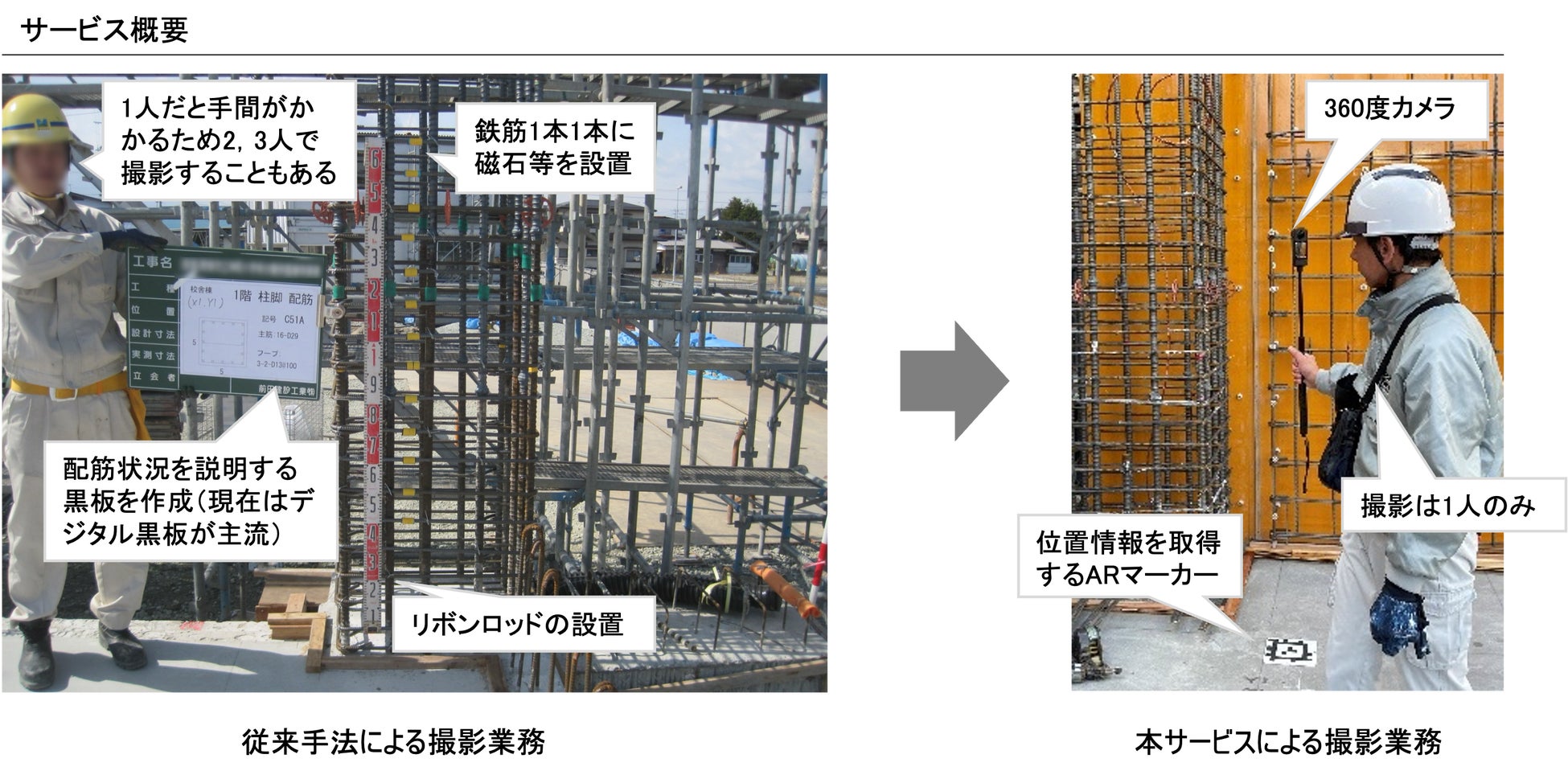 従来手法による工事写真の撮影は、施工者の係員や協力業者が鉄筋の本数を数えるためのマグネットや、長さを測るためのリボンロッドを持ち、現場を巡回しながら1枚ずつ静止画で撮影を行うため、現場にとって大きな負担となっています。本サービスは、現場係員が撮影した360度動画をアップロードし、その後BPOにより静止画を切り出し、その切出した画像上に本数確認のためのチェックマークや長さを測るためのデジタルメジャーを設置することができるため、現場での撮影の時間を大きく削減することができます。