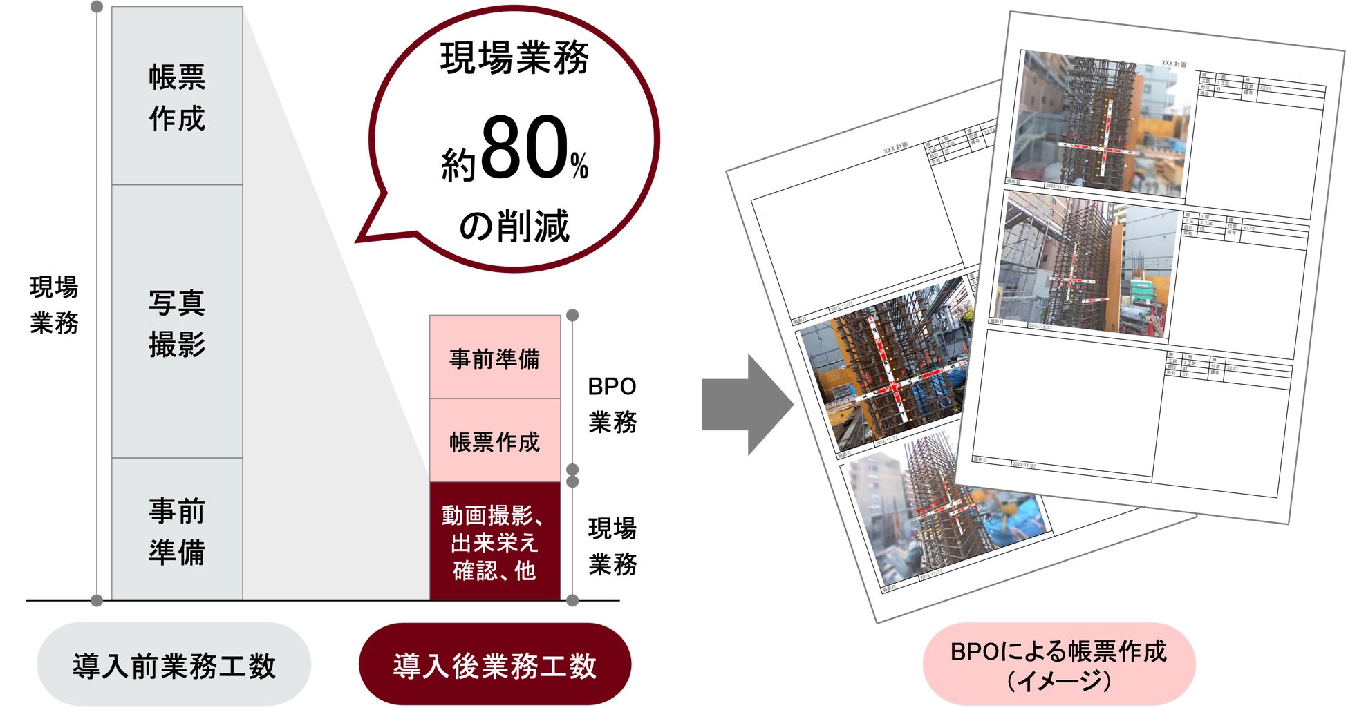 前田建設内の実証実験では、本サービスが対象とする配筋写真の撮影と帳票作成に必要な現場工数が約80%削減されました(本サービスが対象としない写真も含めた、配筋に関わる全ての写真撮影と帳票作成を比較した場合は約50%削減)。