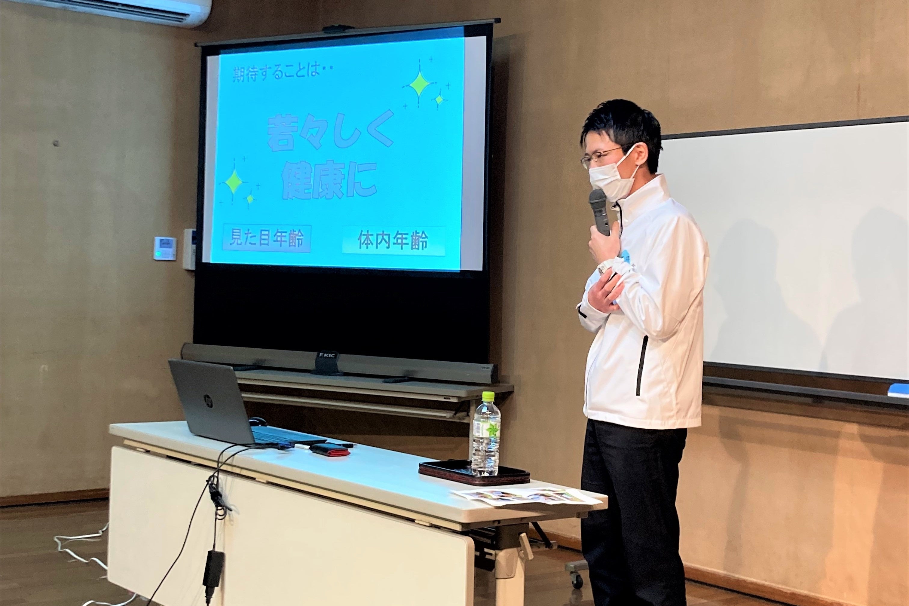 「見た目年齢」の若さは、外見の改善だけで良い様に感じますが、「体内年齢」も「見た目年齢」に影響します。生活習慣を見直して、見た目も中身も若々しく健康に過ごすにはどうすれば良いかなど姿勢や呼吸についてお話があり、健康に過ごす為のストレッチを参加された方と一緒に行っていました。