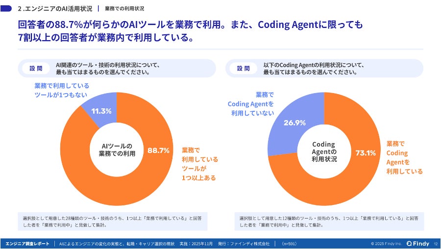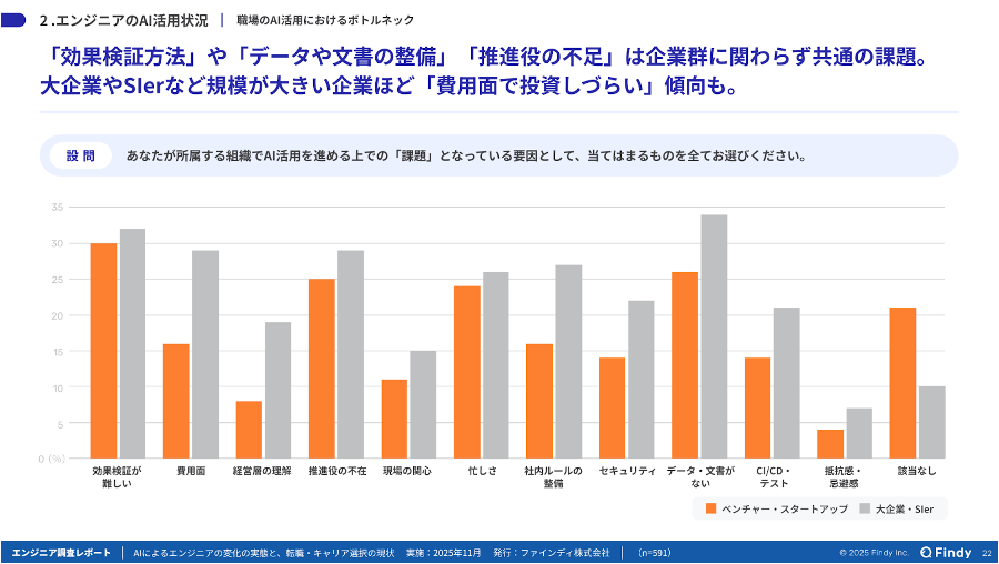 当社が2025年11月に実施した「AIによるエンジニアの変化の実態と転職・キャリア選択の現状」調査(n=591)では、88.7%のエンジニアが業務で何らかのAIツールを利用している一方、職場のAI活用における最大のボトルネックとして「効果検証が難しい」が企業規模を問わず最上位に挙がっています。こうした結果に加えて、当社がクライアント企業から伺う中で、多くの開発組織で、