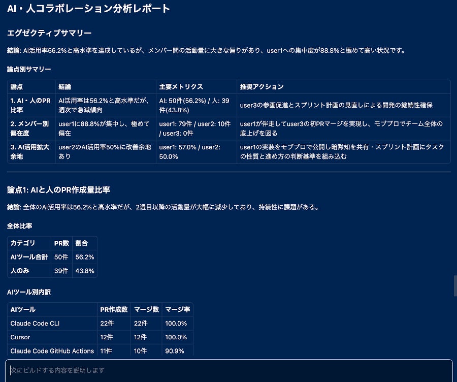 合同会社DMM.comのプラットフォーム開発本部は、「AIネイティブな開発プロセス」の構築を目標に複数の生成AIを導入。その投資対効果(ROI)を客観的に検証する手段として「Findy AI+」を活用し、人とDevin AIのパフォーマンスを多面的に分析しました(※6)。人間チーム(12名)とDevin AI(1体)が並行稼働した期間の比較分析では、以下が明らかになりました。