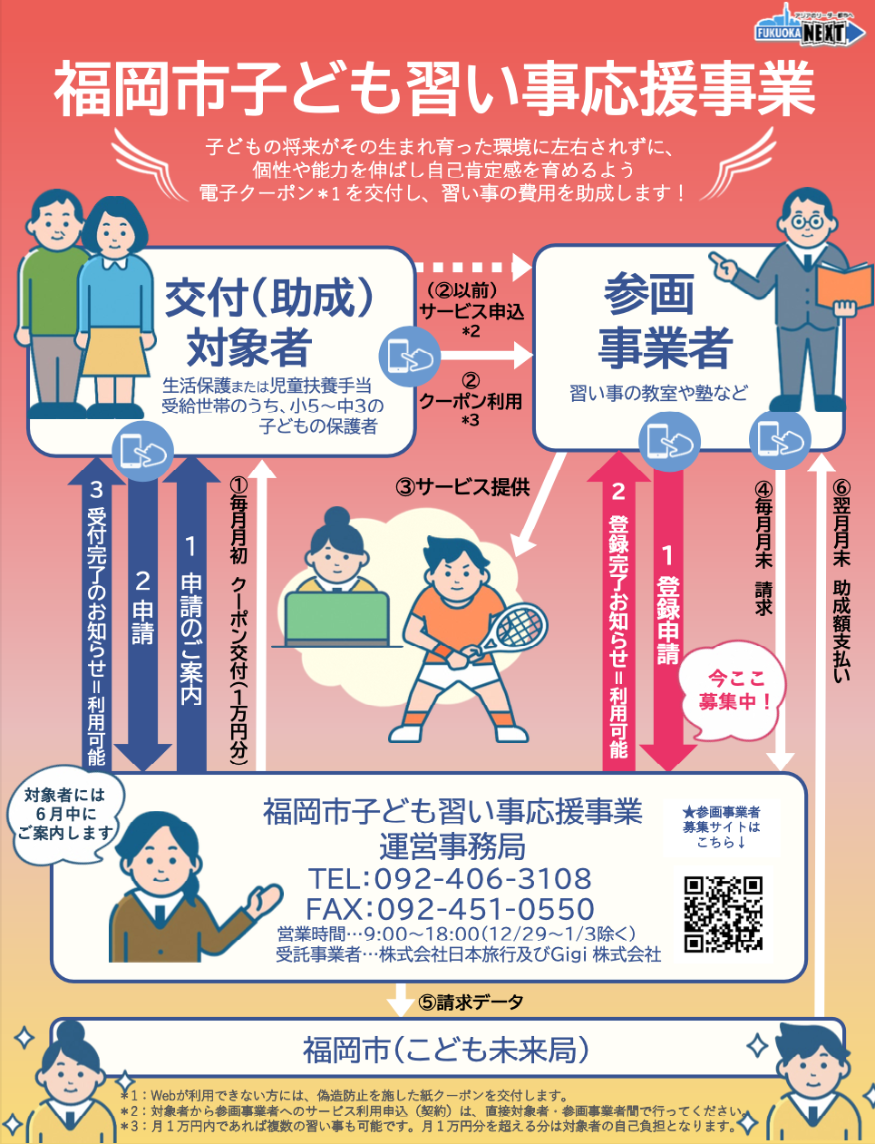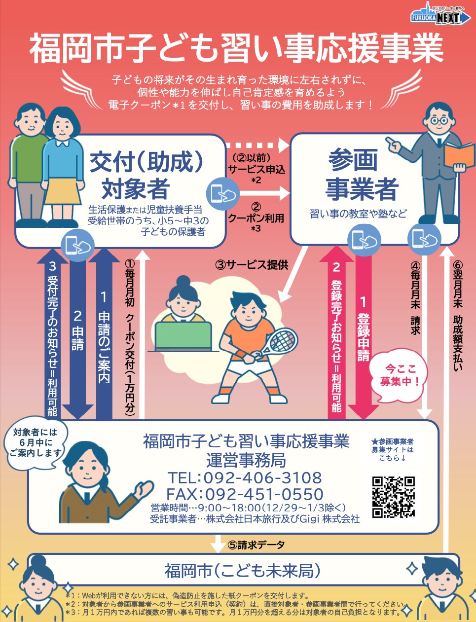 本年7月からの開始に向けて、福岡市の子ども達を応援するこの事業に参加してくださる、教室や塾、スポーツクラブなどの募集を開始します。