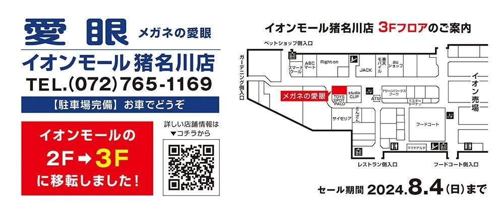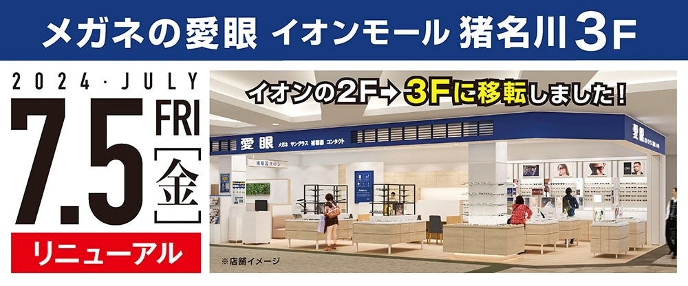 イオンモール猪名川に出店している「メガネの愛眼 イオンモール猪名川店」を2024年7月5日(金)、2Fから3Fへ移転リニューアルオープンしましたことをお知らせします。