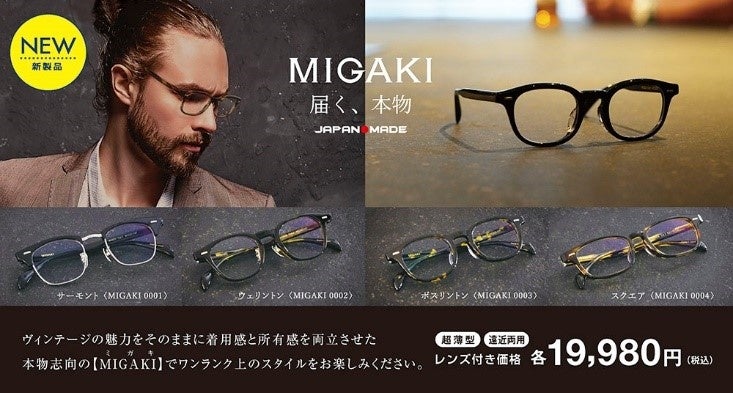 『本格的なクラシックデザイン』をコンセプトとした国産の新ブランドメガネ、“MIGAKI(ミガキ)” はデザインと素材にこだわり、「贅沢なまでの光沢感」が2万円を切る価格で実現したメガネです。