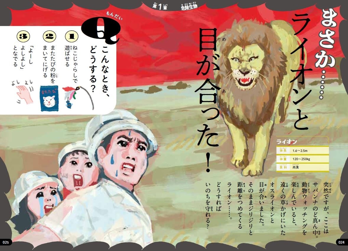 本書では、総監修に池上彰氏を迎え、動物、防災・防犯、医療など各分野の専門家が各章を担当し、専門的な知識を幅広く、かつわかりやすく紹介しています。「ライオンと目が合った」など、サバンナにでも行かない限り出合わない危険や、夏に多い熱中症、海・川などのレジャー、異常気象による危険、不審者や闇バイトなど犯罪に関する危険から、「学校でうんこをもらした」「いじめにあった」など身の回りの危険まで、幅広く網羅。また、近年特に問題視されている性的グルーミングやSNS犯罪などについても丁寧に解説しています。