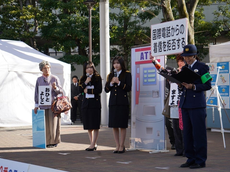 昨年(令和6年)、大阪府内では還付金詐欺の被害が深刻な状況であり、NMB48塩月支援官・青原支援官は、大阪府警の防犯寸劇チームとともに防犯教室に参加、犯人から「還付金を受け取るためにATMを操作して」と言われる手口を紹介しつつ、被害を防ぐため固定電話対策として、「国際電話からの着信を拒否する」など具体的な対策を呼びかけ、申込みのための書類の書き方等を説明しました。