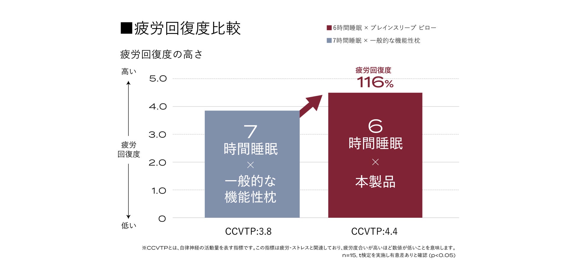 「一般的な機能性枕で7時間睡眠」よりも、疲労回復度116%