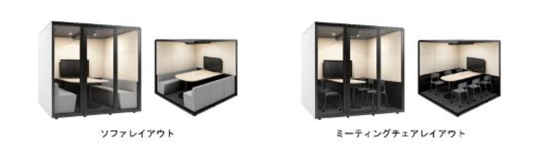 従来の4人までのテレキューブは、内装がソファタイプで固定されていましたが、多人数用テレキューブでは広い空間を活かし、お客様自身でレイアウトをコーディネートできるよう、筐体のみのプランをご用意しました。