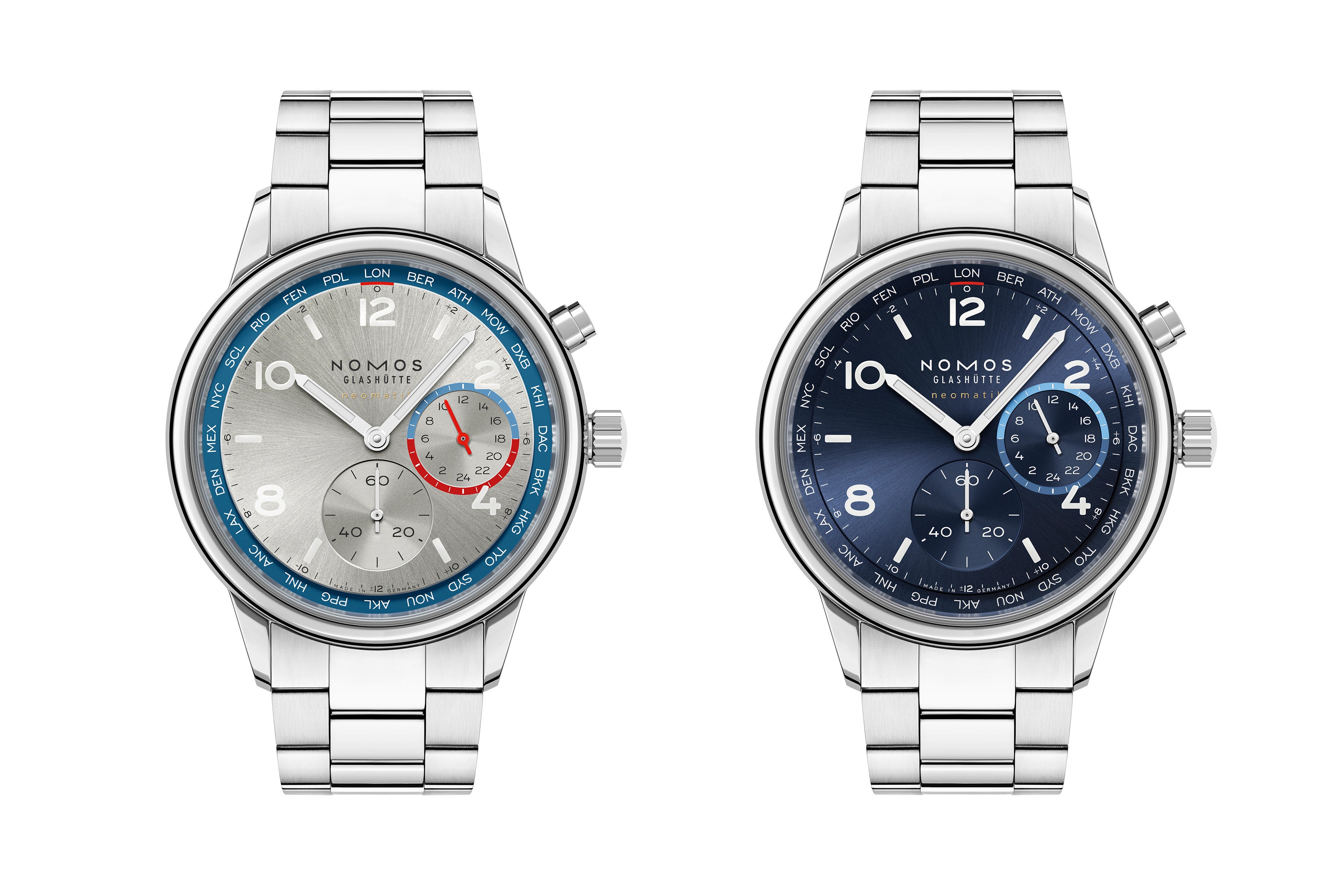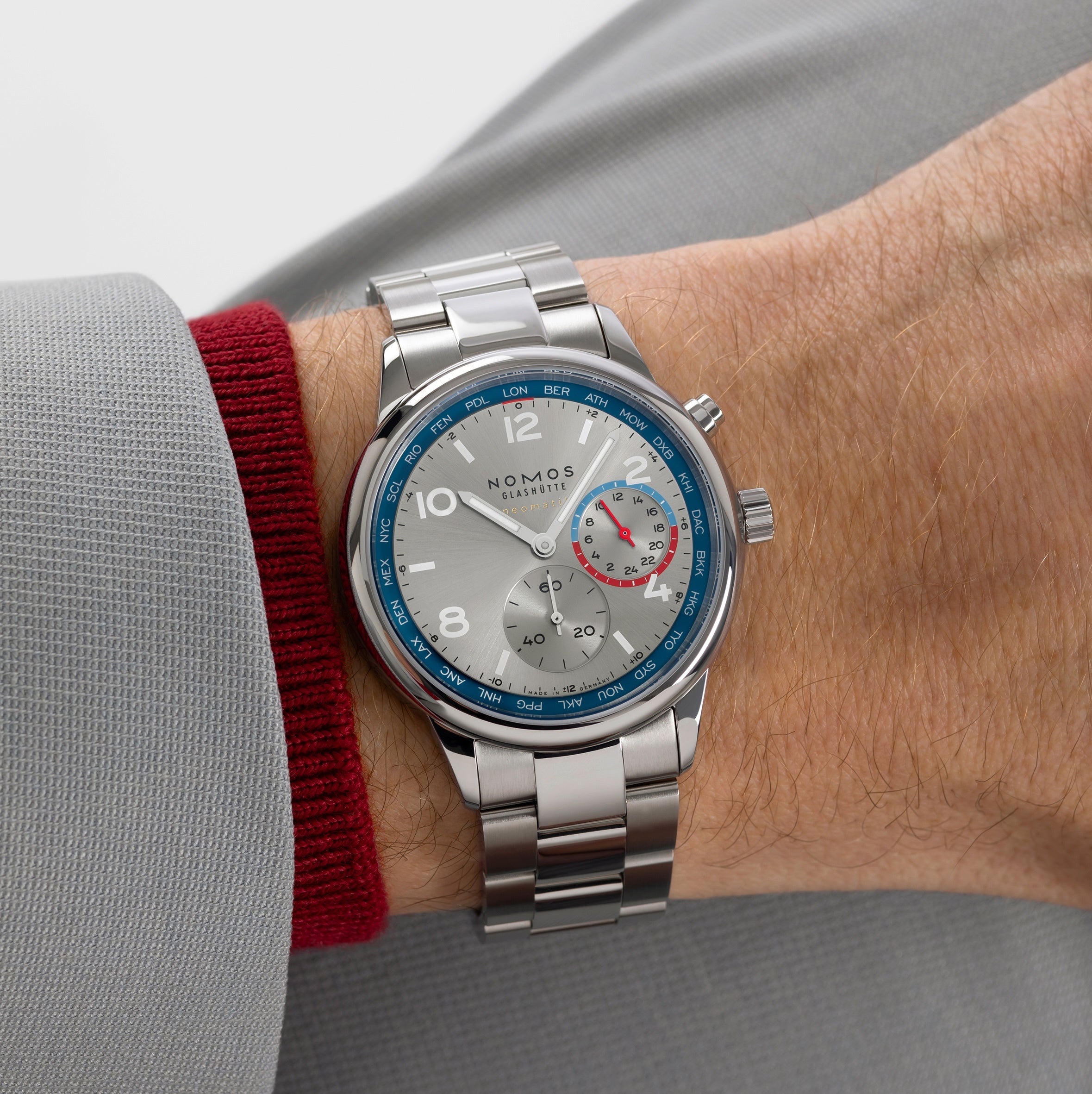 Watch&Wonders 2025 での発表以来、瞬く間にノモスのベストセラーの1つとなった「 クラブスポーツ ネオマティック ワールドタイマー」。NOMOSが得意とするミニマムで美しいデザイン、シンプルで画期的な機能を兼ね備え、高い評価と成功を収めているスポーツウォッチです。