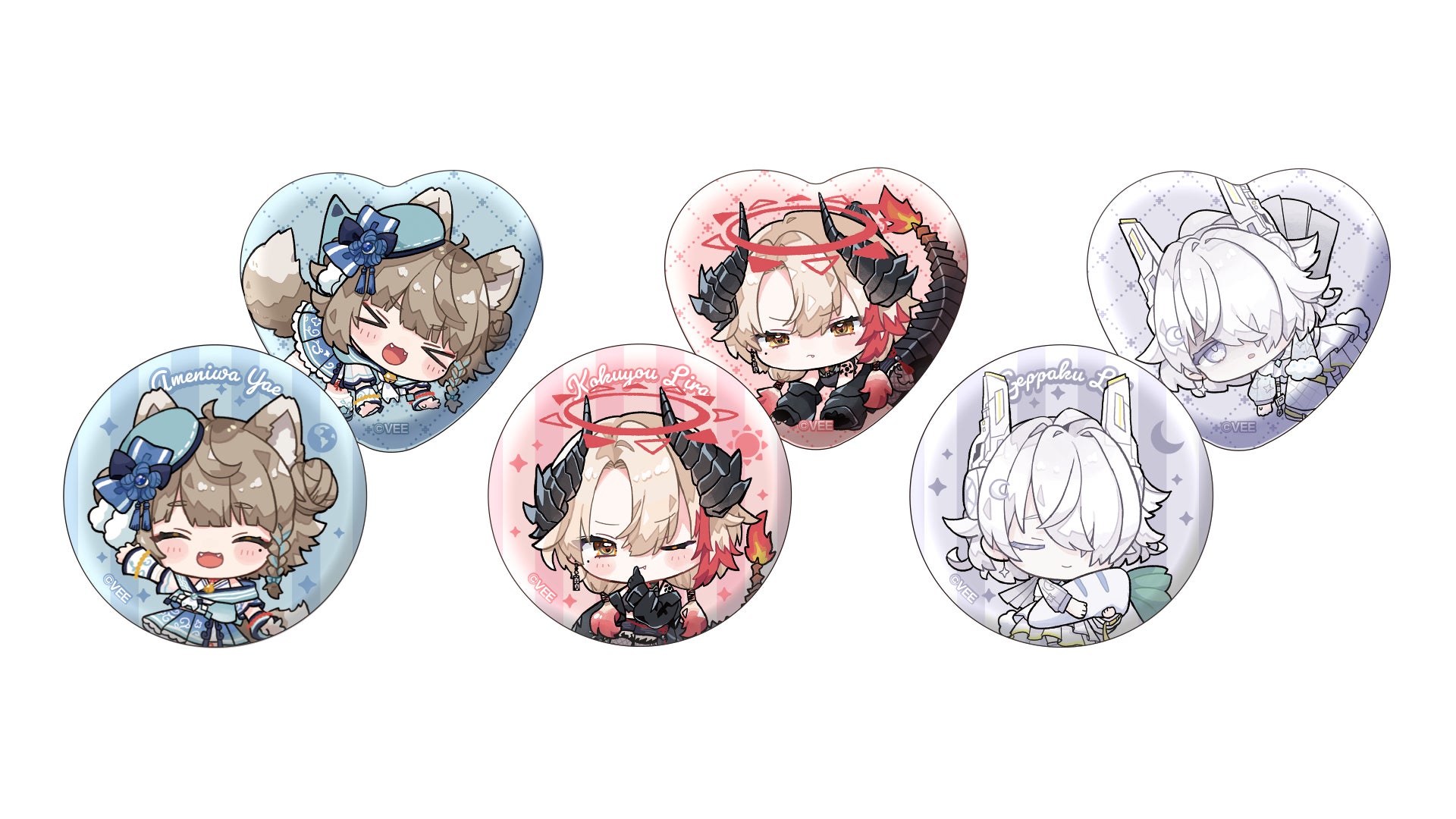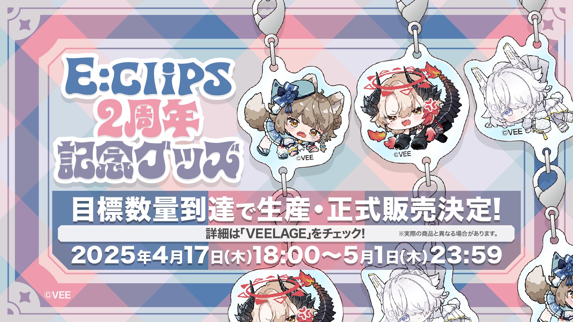 株式会社ソニー・ミュージックエンタテインメント(本社:東京都千代田区)は、バーチャルタレント育成&マネジメントプロジェクト「VEE」の公式ファンコミュニティ「VEELLAGE」にて、所属バーチャルタレント「雨庭やえ × 黒燿リラ × 月白 累」のE:clips2周年記念グッズとして缶バッジ2個セット、ミニアクスタ、つながるアクリルチャーム、ステッカーの販売を開始したことをお知らせします。
