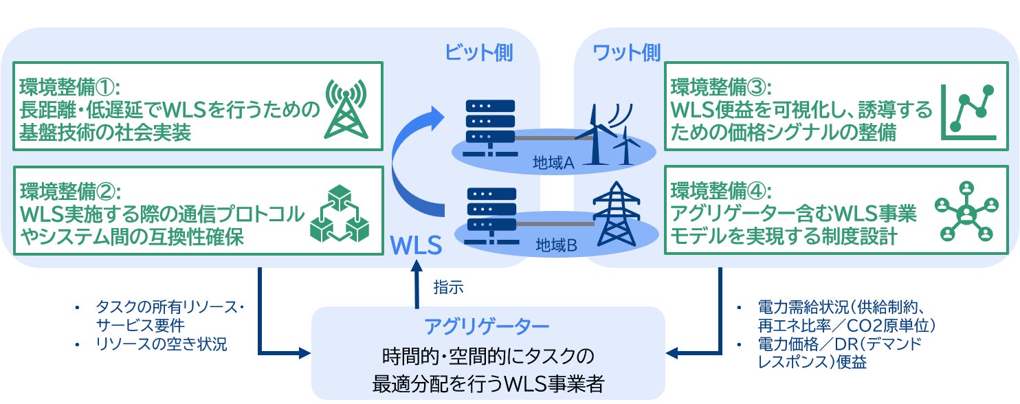 電力需給の変動と計算負荷の変動をマッチングすることにより、ワットとビット双方の運用効率は向上します。この実現には、計算負荷を柔軟に移動させるワークロードシフト(以下 WLS)の実装がカギとなります。そのためには、WLSを実現する技術的な取り組みだけではなく、WLSを実装するための価格シグナルの整備や、WLSの運用を担うアグリゲーター(仲介者)を含む事業モデルの設計などが必要です。