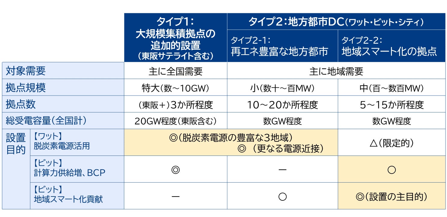 株式会社三菱総合研究所(代表取締役社長:籔田健二、以下 MRI)は、国内でのデータセンター(以下 DC)投資拡大で注目を集める「ワット・ビット連携」について、脱炭素電源活用等を踏まえ、5つの大規模集積拠点に加え2つのタイプの地域DCを数十カ所程度最適配置したDC分散の将来像と、地域DCを活用した地域活性化策を提言します。