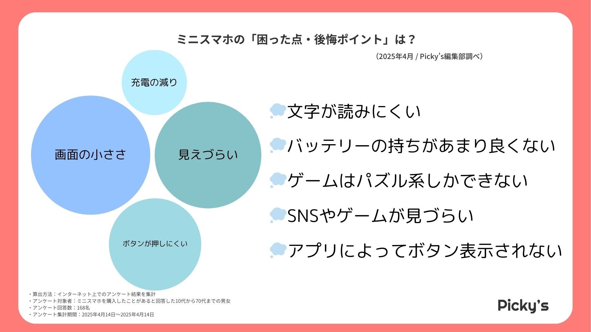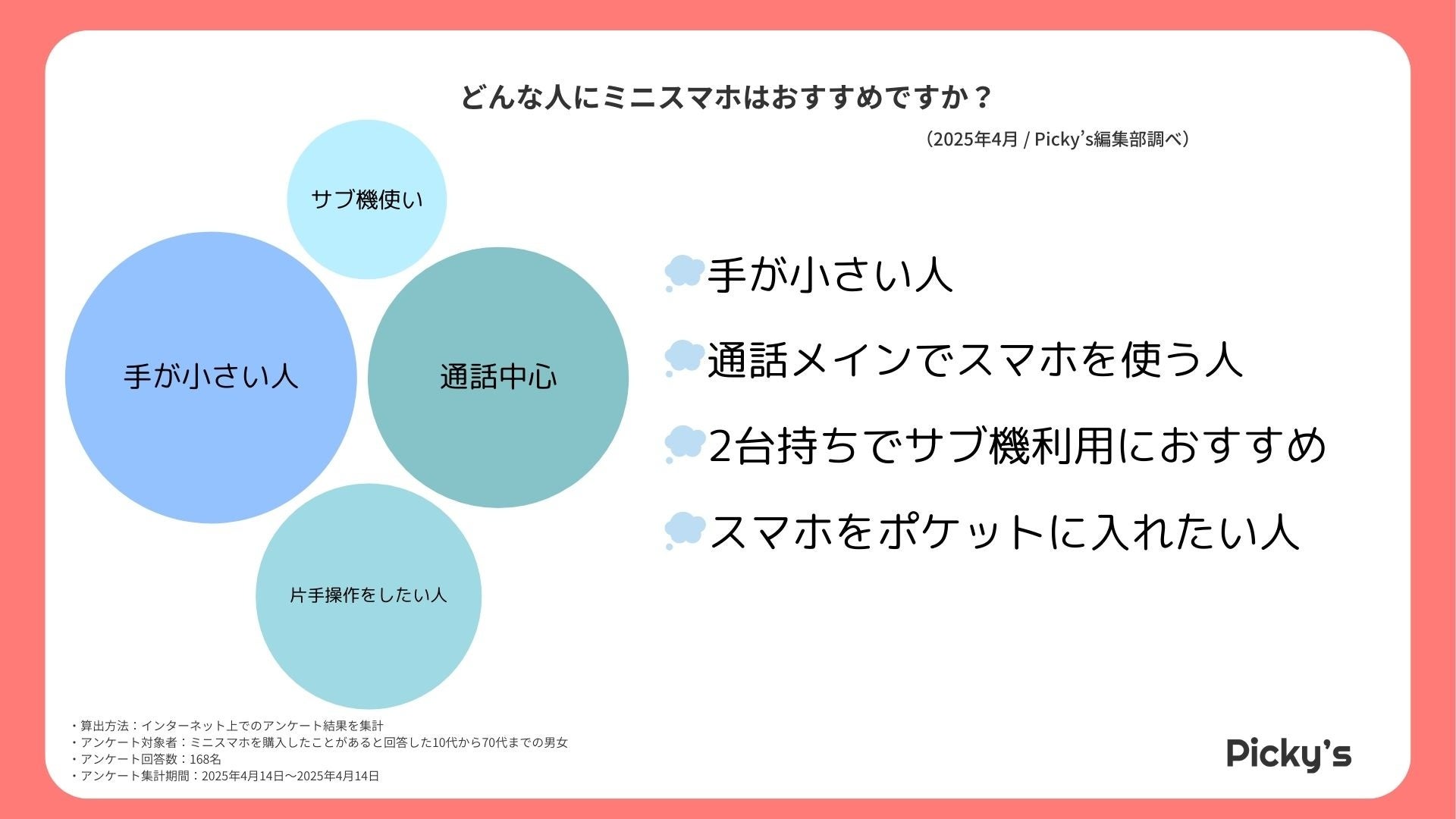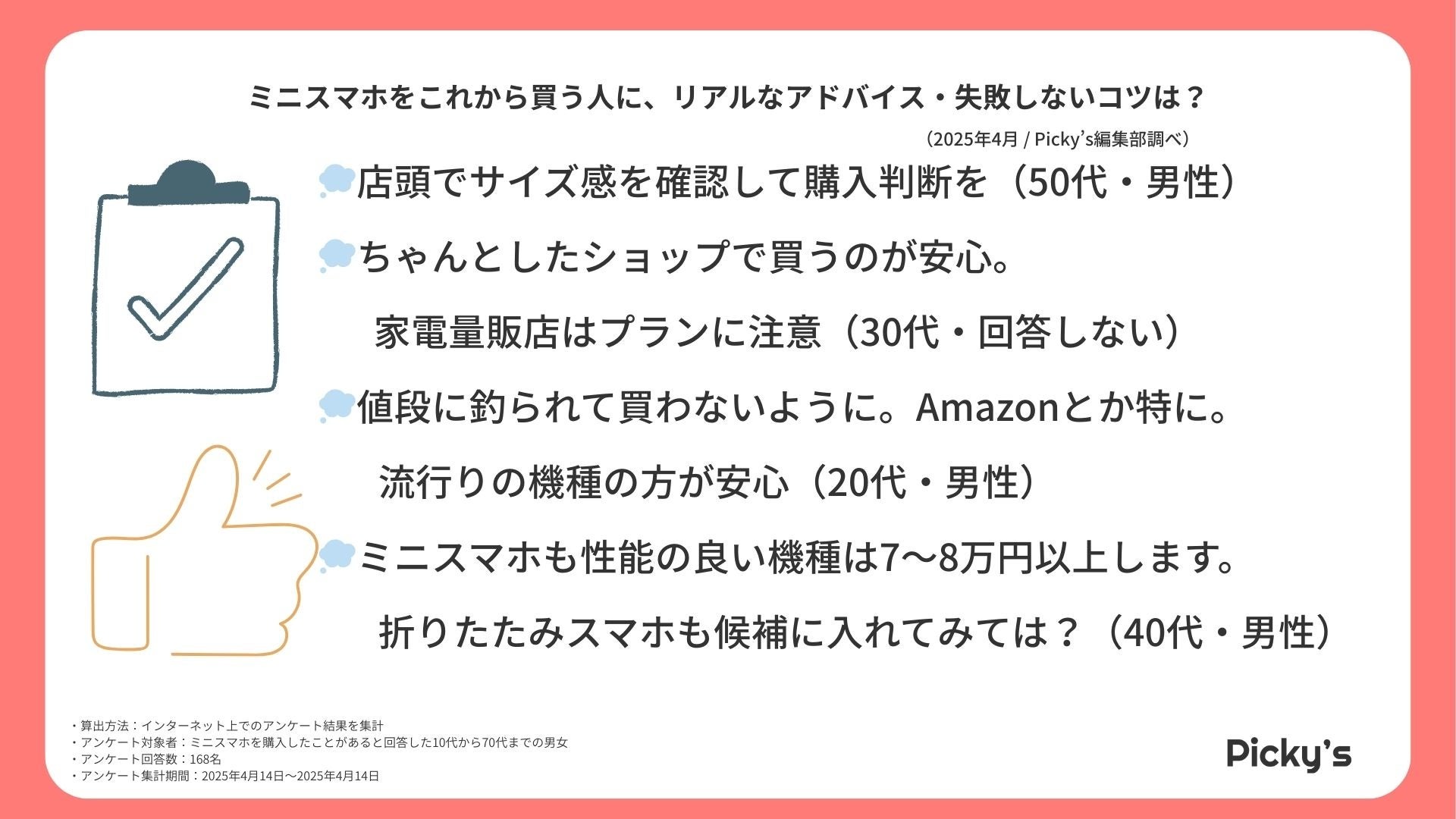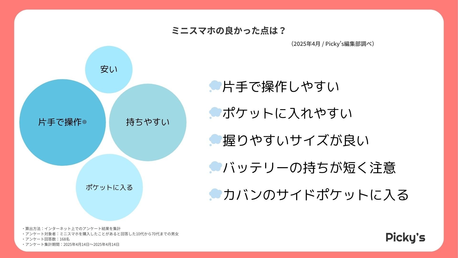 このたびPicky’s(https://picky-s.jp/)およびPicky’s Life(https://pickys-life.jp/)では、インターネット上でミニスマホに関するアンケート調査を実施し、その結果を発表します。