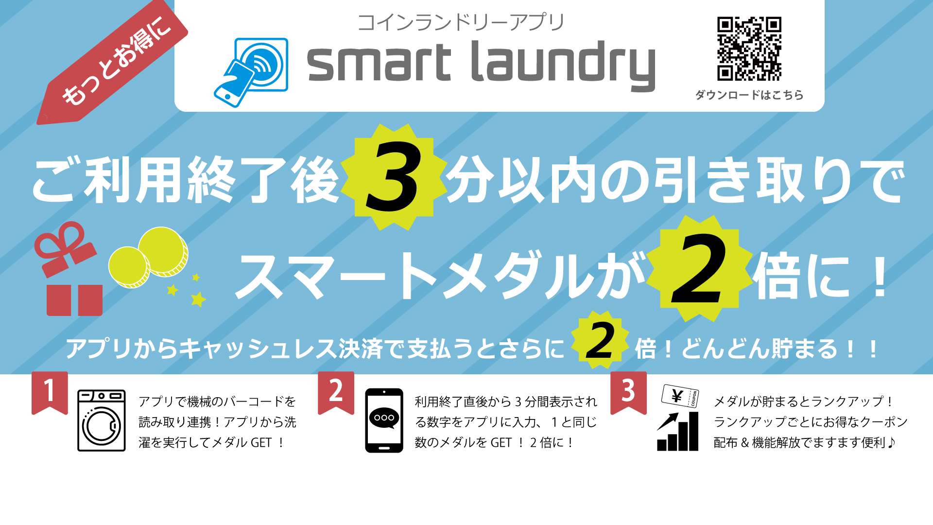 ※スマートメダルの対応や獲得数などの運用は、「smart laundry」導入の店舗により異なります。詳細は店頭でご確認ください。