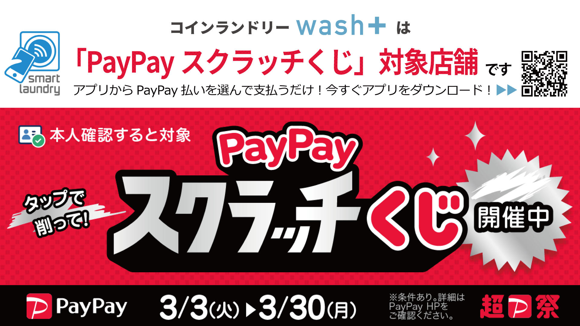株式会社wash-plus(本社:千葉県浦安市、代表取締役:高梨健太郎)が運営する「コインランドリーwash+(ウォッシュプラス)」は、2026年3月3日(火)~3月30日(月)に実施される「PayPayスクラッチくじ」の対象店舗です。
