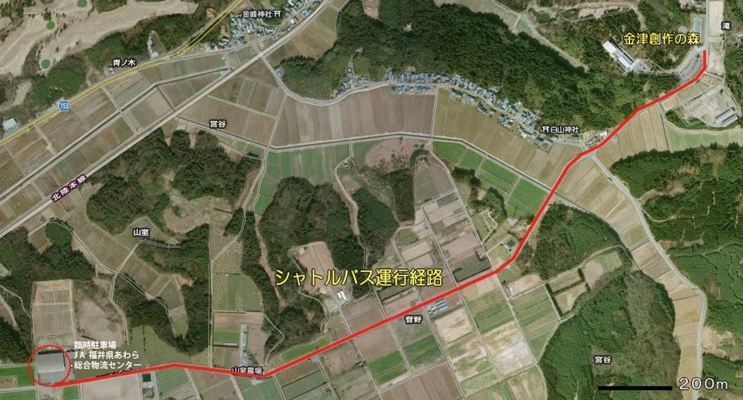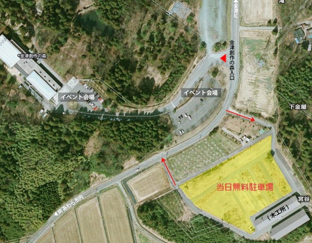 一般来場者は、創作の森入口手前の①無料駐車場(木工所駐車場)をご利用ください。 ①が満車の場合は、②臨時駐車場(JA福井県あわら総合物流センター)をご利用ください。無料シャトルバスが運行されます。