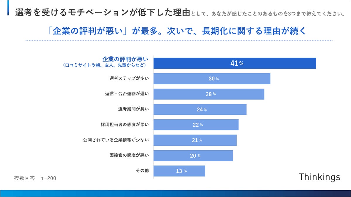 選考意欲が下がる理由は「企業の評判が悪い」が最多。次いで、長期化に関する理由が続く