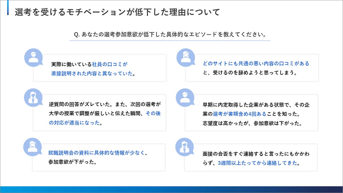 今回、選考モチベーションを下げる理由の上位に、「選考ステップが多い」「返信が遅い」などが挙げられました。しかし、「選考ステップを減らす」「連絡を早める」といった対策だけでは「しっかり自分を見てもらえているのか」などの不安を生む可能性もあります。学生の声をそのまま真に受けるのではなく、より本質的な改善につなげるヒントにする思考が重要です。