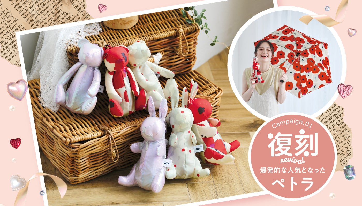 2012年の発売後、爆発的な人気となった折りたたみ傘「ペトラ」は『ペットといつも一緒にいるような気持ちで、持ち歩くのが楽しくなるように』という願いを込めて12年前に誕生した傘です。この度、Wpc.ブランド創立20周年を記念した復刻バージョンが登場!キュートな見た目が愛らしいうさぎとくまのデザインで発売します。