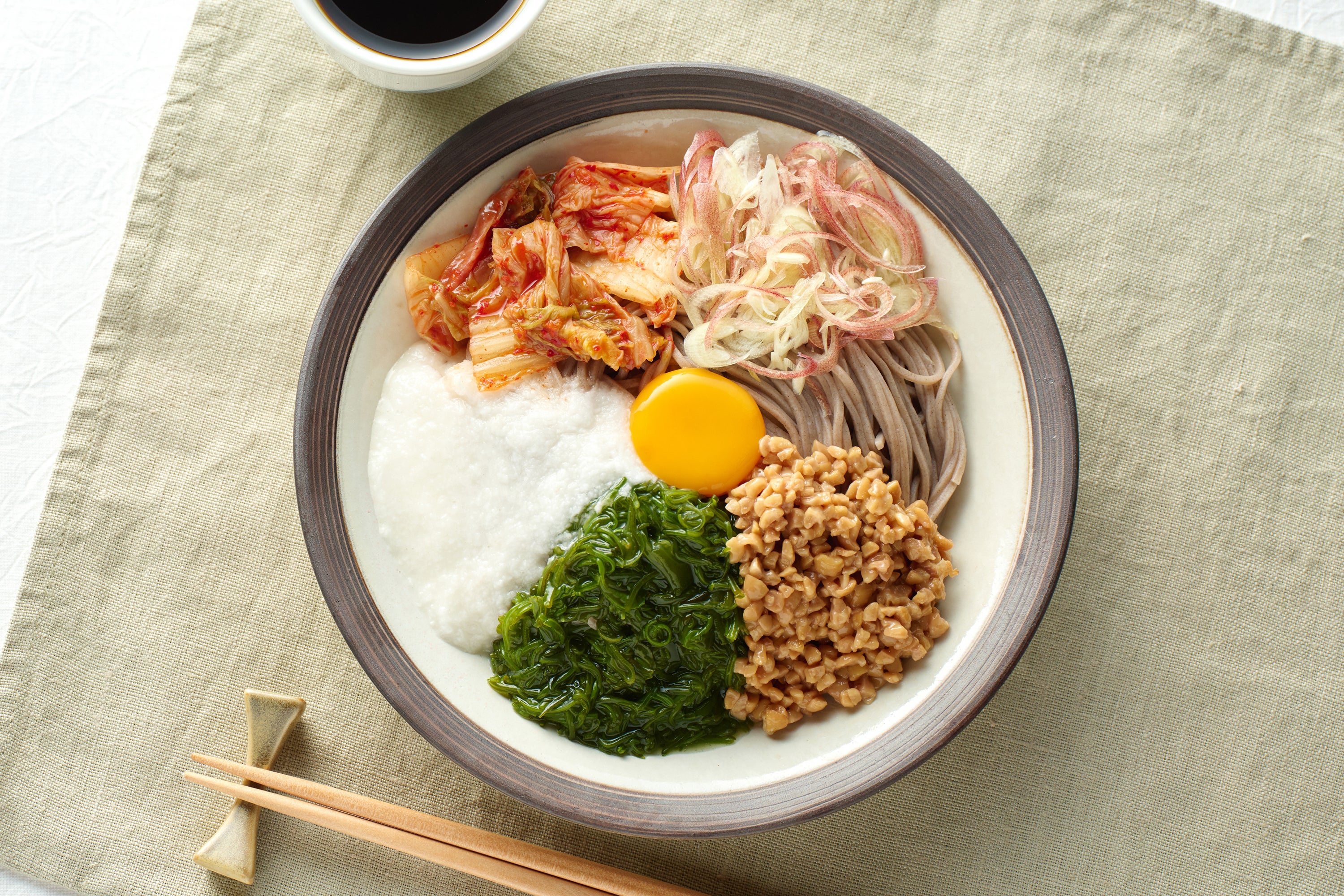 『あすけん』の食事記録データでは、「ざるそば(麺)」というキーワードが昨年比で約17倍、「もりそば(そばのみ)」というキーワードが昨年比で約7倍など、「つゆなしそば」の記録率が大幅に増加しました。この「つゆなしそば」と一緒に食べられている食材として、「納豆」「キムチ」「とろろ芋」「オクラ」「温泉たまご」といった、野菜や発酵食品、たんぱく質を含むキーワードが上昇しています。このデータから、そばにさまざまなトッピングを加え、栄養価を高めて食べる人たちが増えていることがうかがえます。SNSでもこの食べ方は多く投稿され、健康志向の高い層やダイエット層の間で支持を集めました。