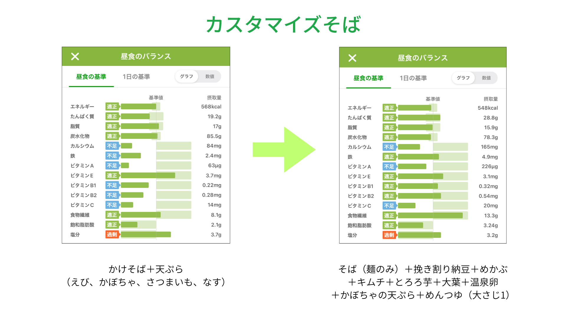 ・カロリーと各種栄養素14項目*³の過不足をグラフ表示