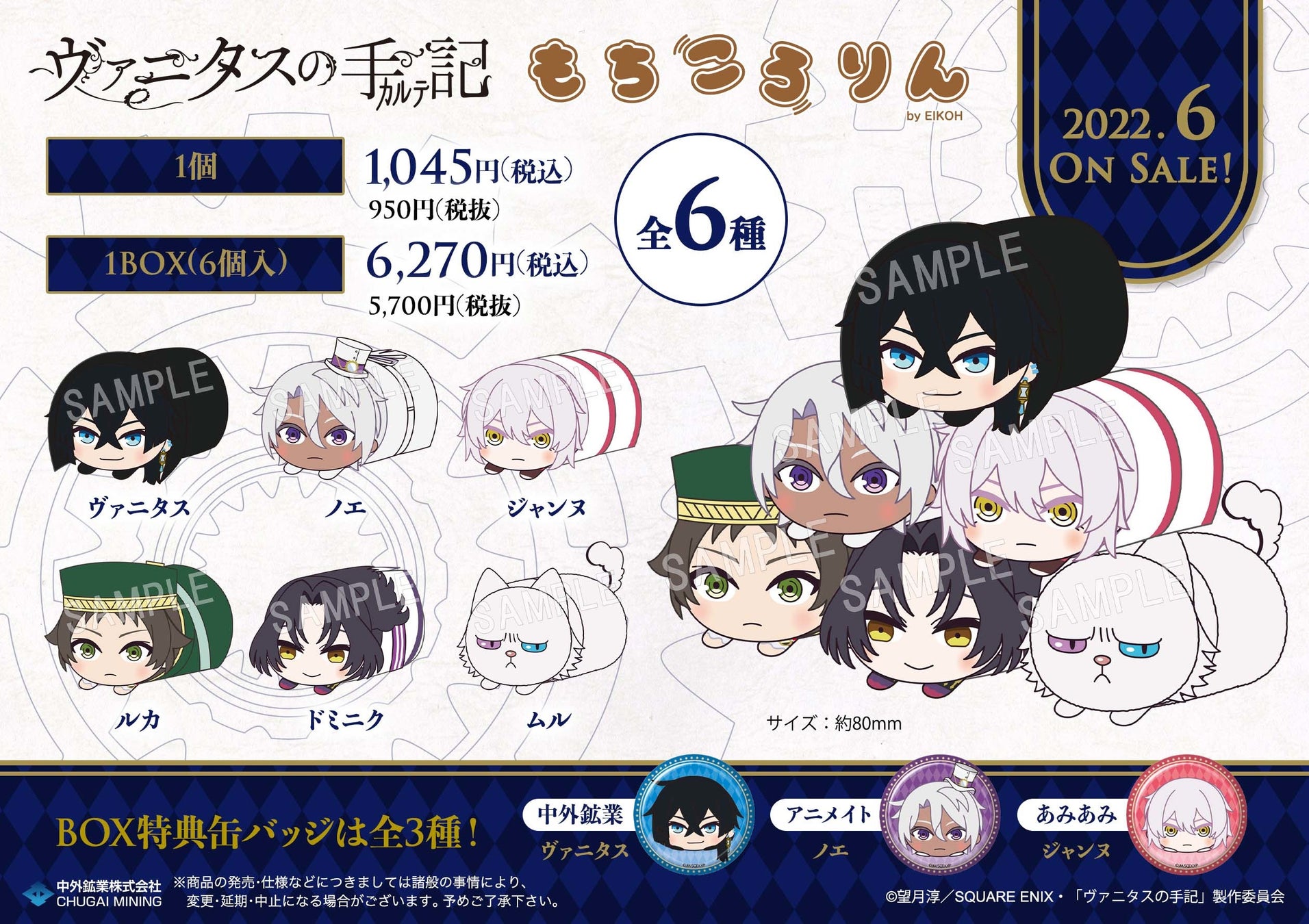キャラクターグッズの商品企画・製作・販売を行う中外鉱業株式会社コンテンツ部は、TVアニメ『ヴァニタスの手記』より「もちころりん ぬいぐるみマスコット」を販売いたします。2022年6月発売予定となります。