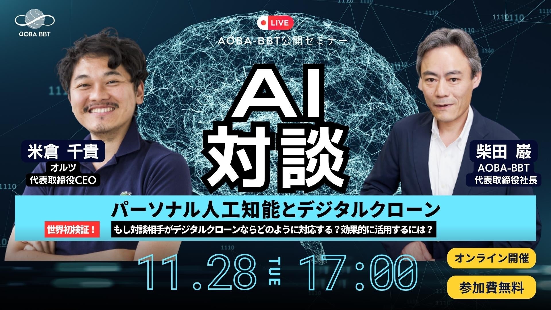 このような人工知能の技術進展と社会への影響を踏まえ、Aoba-BBTは「パーソナル人工知能とデジタルクローン」をテーマにした公開セミナーを開催することを決定しました。本セミナーでは、Aoba-BBTの代表取締役社長、柴田巌がモデレーターを務め、特別ゲストとして株式会社オルツのCEO米倉千貴氏をお迎えします。
