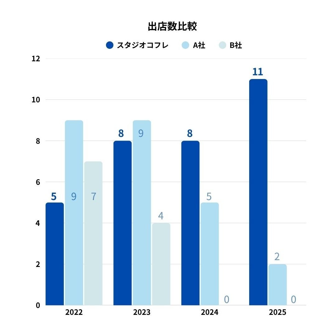 昨今のフォトスタジオ業界は、少子化の進行も相まって飽和状態にあるとも言われています。業界全体で出店スピードが減速傾向にある中、スタジオコフレは、フォトジェニックな空間やオリジナル衣装、ゆったり撮影できるスタイル等がママを中心に支持され、堅調に店舗を増やしてまいりました。