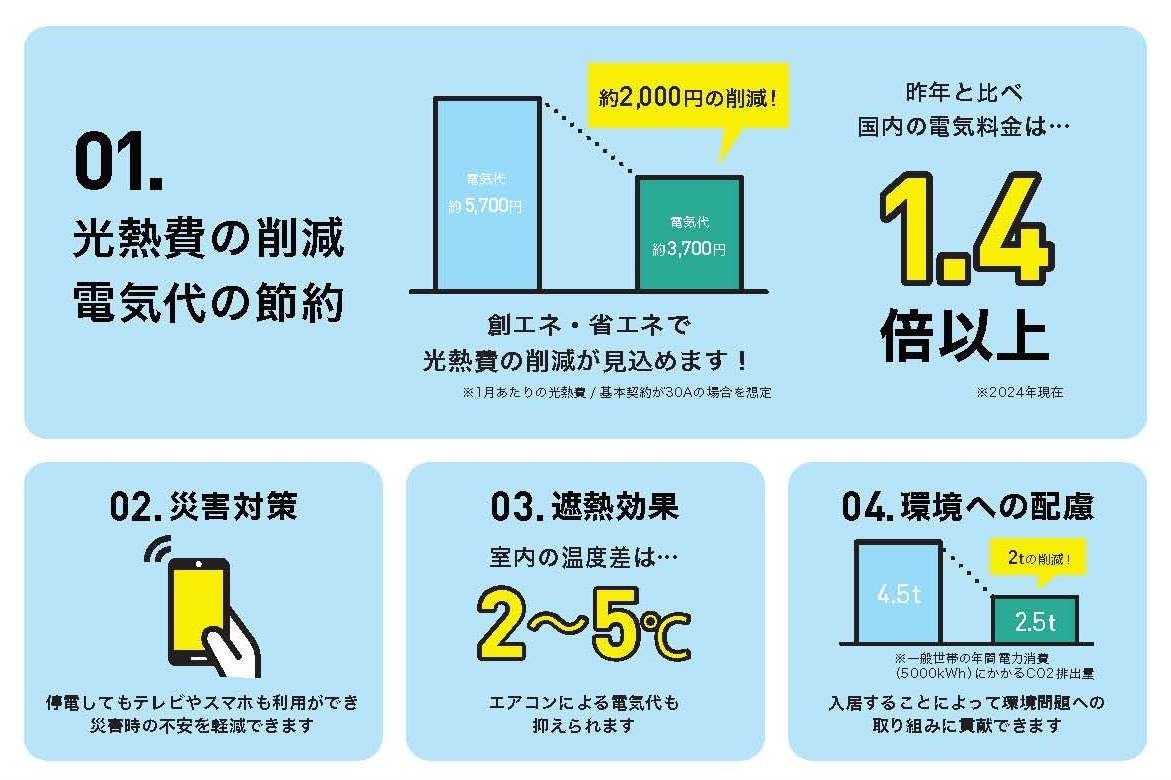 電気代の高騰が全国的に広がる中で、入居者にとっては光熱費の削減や災害対策・環境への配慮など様々なメリットが期待されます。結果的に太陽光発電システムを設置することで、賃貸物件の選定基準の概念を刷新させ、不動産物件の資産価値向上と賃貸経営の長期安定化を目指してまいります。