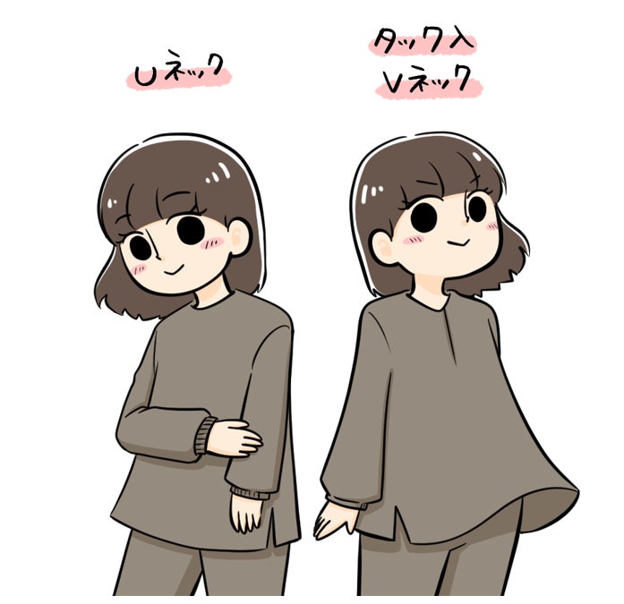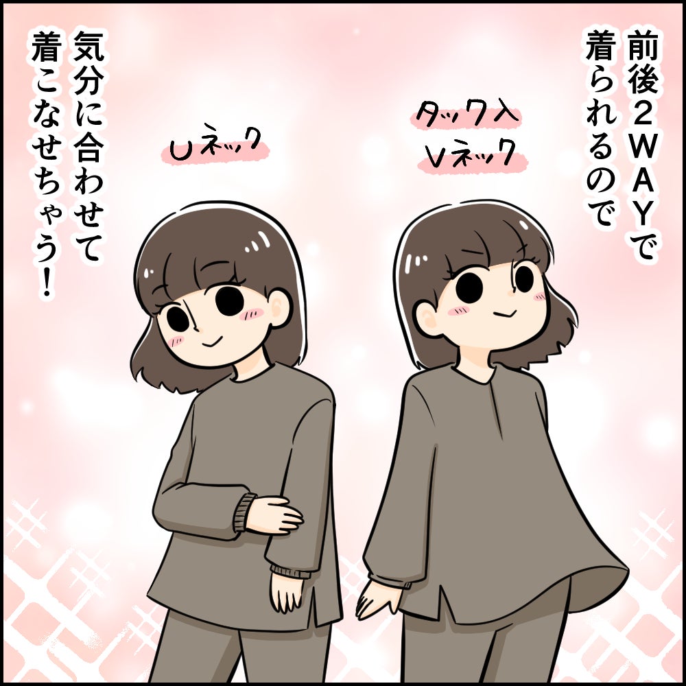 ズボラパジャマは、ネイビーとトープの2色展開。トップスは前後どちらでも着られる2WAY仕様です。片面はフロントタックが入っているVネックでスッキリ見せ。もう片面は、シンプルなUネックだけど袖口ギャザーで飽きのこないデザインに。気分によって使い分けられ、お風呂上がりなど慌てて着ないといけないときでも前後どちらでもOKだから迷うことがありません。