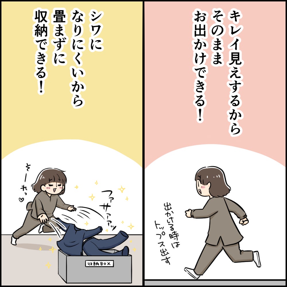 そんな寝るときに過ごしやすい作りでありながらも、急な来客や宅配対応、スーパーや子どもの送迎などでのちょっとした外出にも困らないスッキリ見えを叶えました。毎日キチンとしてるような時間がないけど、でも保育園のお迎えで会うママ友たちから「適当な服を着てる」と思われるのも避けたい…!